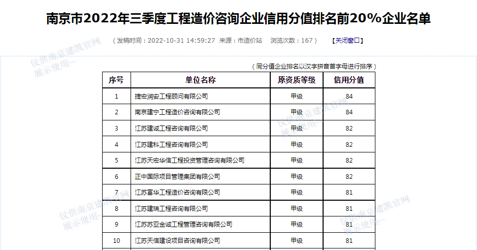 恭喜我司造價(jià)部入選“南京市2022年三季度工程造價(jià)咨詢企業(yè)信用分值排名前20%企業(yè)名單”