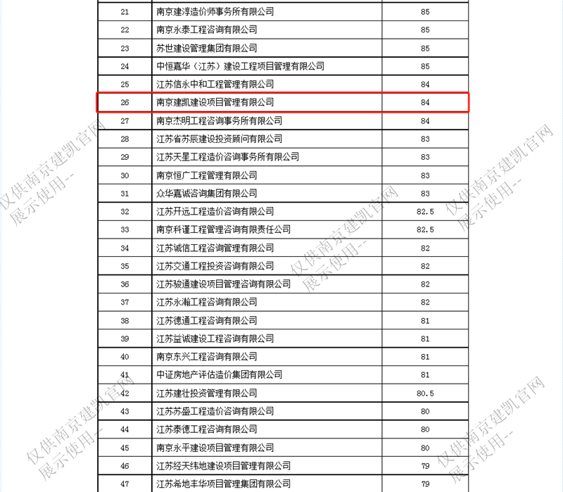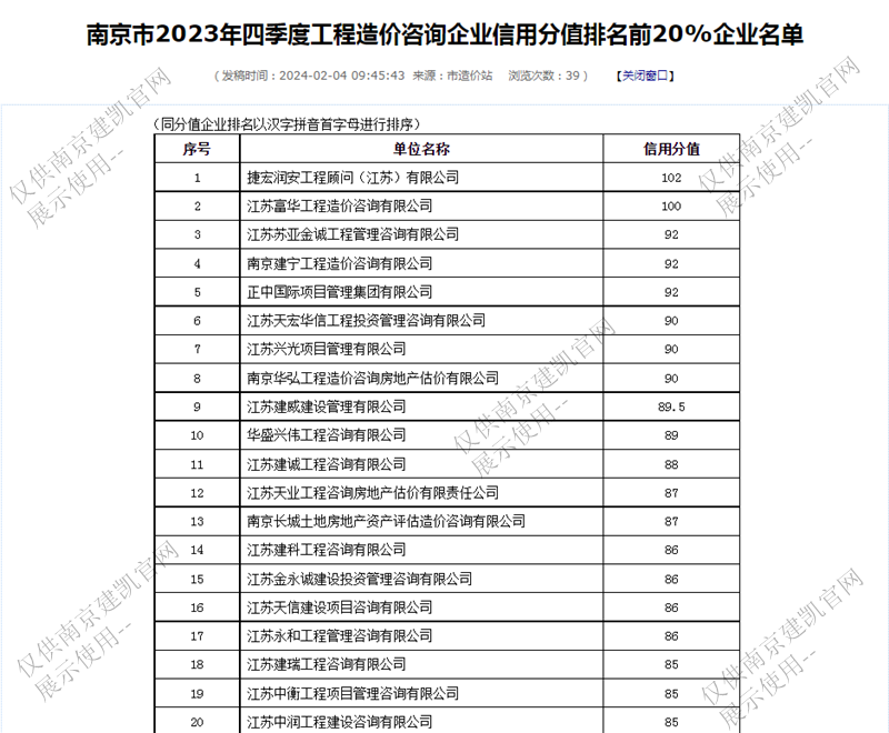 恭喜我司入選“南京市2023年四季度工程造價咨詢企業(yè)信用分值排名前20%企業(yè)名單”