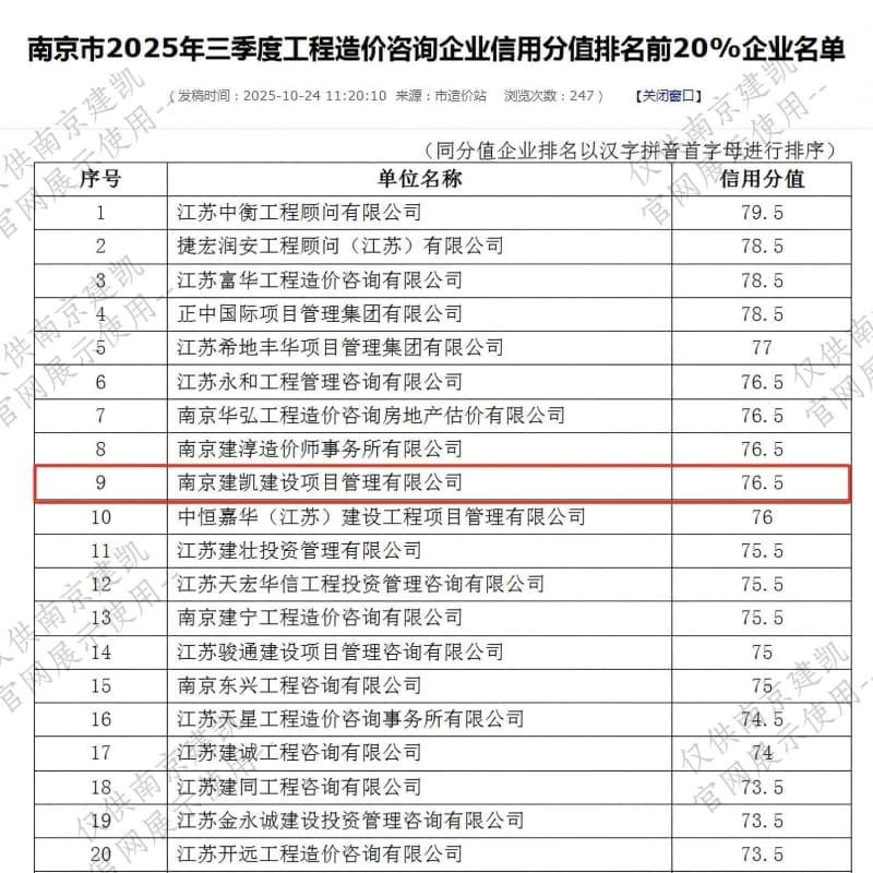 恭喜我司入選“南京市2025年三季度工程造價(jià)咨詢企業(yè)信用分值排名前20%企業(yè)名單”