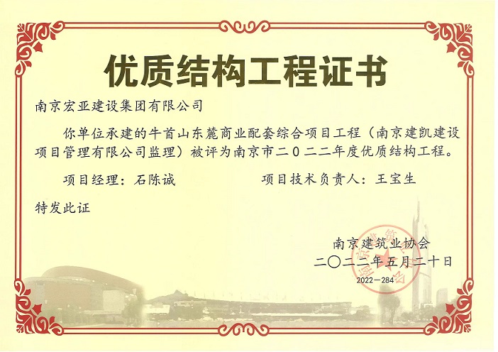 (2022年05月20日)牛首山東麓商業(yè)配套綜合項(xiàng)目榮獲《南京市2022年度優(yōu)質(zhì)結(jié)構(gòu)工程》